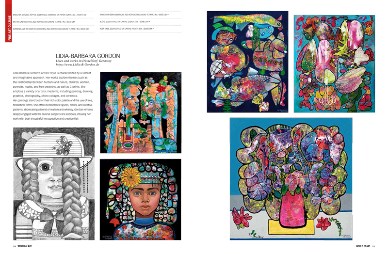 Lidia Barbara Gordon Meine Themen reichen von der Beziehung Mensch-Natur, Kind, Frau über Portraits – Face Art, Akte bis hin zu „Lebensrändern“, freie Arbeiten und C-Print. „Meine Arbeiten als visueller Träger von Gefühlen, Erinnerungen, Gedanken, Ideen und Erfindungen zeigen dann meine persönliche individuelle erfahrene Wirklichkeit. „Wie auch immer ich inspiriert werde, Ureigenes bleibt das Bedürfnis, meine Wahrnehmung durch Kunst immer auf’s Neue auszudrücken. Meine künstlerischen Arbeitsbereiche; Malerei, Zeichnung, Fotografie, Fotocollagen, Keramik. Studium an der Fachhochschule für Kunst in Bromberg als Meisterschülerin bei Prof. Marian Turwid. Fotografie & DTP-Akademie Mediengestaltung für Printmedien, Ratingen. 1950 geboren 1995 Freischaffende bildende Künstlerin 1996 Mitglied im Haus Hildener Künstler, Hilden 2002 Stadtliche Anerkennung NRW Düsseldorf als Künstlerin 2003 Mitglied der Düsseldorfer Künstler, Landeshauptstadt Düsseldorf 2009 Mitglied im Bundesverband Bildender Künstlerinnen und Künstler Düsseldorf Seit 2009 Fotodokumentation BBK- Events Seit 1995 stelle ich meine Arbeiten in Einzel- und Gruppenausstellungen öffentlich aus. Die bewußten Ideen, die vor 1995 entstanden sind und danach umgesetzt wurden - z. B. Zyklus "Imaginierung" (33 Bilder), "Überwindung" (4 Bilder),"Der Mensch reduziert..." (10 Bilder), "Auf dem roten Teppich" (12 teilig), "Aktkonkret" (mehr als 200 Bilder), "Kleine Prinzen und Prinzessinen 12 teilig", "Kinder Portraits; Zeitlos Momentaufnahmen mit 100 Bildern", "Bräute" (10 Bilder), "Der Dadaismus" (5 Bilder), "Strom" (2 Bilder), "Pandemie, Klimaveränderung, Coronavirus", usw sind in weiteren Bereichen meiner Arbeiten fortgesetzt worden. Mein starkes Anliegen ist es, Kinder zu zeigen wie sie sind: Ihre Fröhlichkeit und Spontaneität, ihre Originalität und Ernsthaftigkeit. Ich stelle Kinder als Individuen und als Persönlichkeiten dar, die ihren eigenen Platz in der Gesellschaft einnehmen. Mein weites starkes Anliegen sind, Imaginations-Fotocollagen und Fotografie. In meinen visionären Bilderträumen zeige ich die inneren Welten von Menschen und deren Vorstellungen, wie man sie vorher noch nie gesehen hat. Meine Fotografien erscheinen wie Schnappschüsse eines Traumes, die uns einladen zu genießen und uns zum Nachdenken anregen wollen. Mein drittes starkes Anliegen ist, "Aktkonkret". Ich beschäftige mich mit dem weiblichen Körper aus der Sicht einer Frau. Mir geht es darum zu zeigen, welche Beziehung meine Figuren zu ihrem Körper haben. Sie drücken, ganz eigene Stärke und Würde aus. Mein viertes starkes Anliegen sind, freie Malerei, Keramik. Ich zeige die Darstellung der realen Welt im Wechsel mit dem Hintergrund einer leisen Vorahnung, dass das Reale keinen Bestand hat und vergänglich ist. Kontakte: Link: www.BBK Düsseldorf www.Harold-Augustin.de www.Kunstpunkte www.Hofstrasse6.de WORLD of ART Seite114-115 LIDIA-BARBARA GORDON Lives and works in Düsseldorf, Germany https://www.Lidia-B-Gordon.de Lidia Barbara Gordon's artistic style is characterized by a vibrant and imaginative approach. Her works explore themes such as the relationship between humans and nature, children, women, portraits, nudes, and free creations, as well as C-prints. She employs a variety of artistic mediums, including painting, drawing, graphics, photography, photo collages, and ceramics. Her paintings stand out for their rich color palette and the use of free, fantastical forms. She often incorporates figures, plants, and creative patterns, showcasing a blend of realism and whimsy. Gordon remains deeply engaged with the diverse subjects she explores, infusing herwork with both thoughtful introspection and creative flair. |